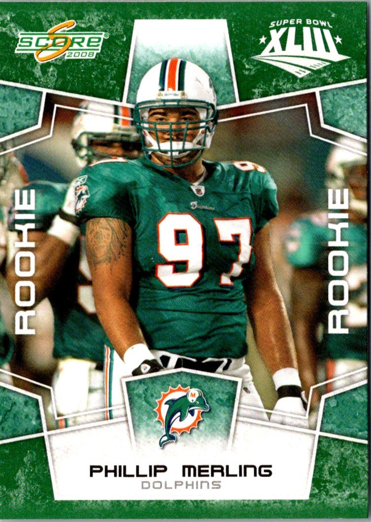 This 2008 Score Super Bowl XLIII Phillip Merling #355 card is a must-have for any Miami Dolphins fan! It features an action shot of Merling in his classic Dolphins uniform. His name and number are also featured on the card in bold font. Merling was a defensive end for the Dolphins from 2008-2012 and was a key player in the team's success. Get this card now and show your support for your favorite NFL team!