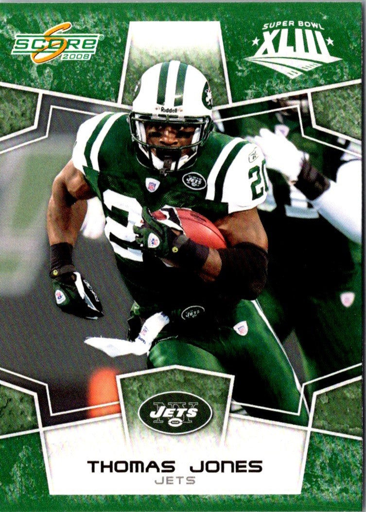 The 2008 Score Super Bowl XLIII Thomas Jones #223 New York Jets card is a must-have for any serious football fan. With a stunning full-color image of Thomas Jones on the card's front, the card is sure to stand out in any collection. The back side of the card features a detailed bio of Jones' career accomplishments, along with a list of his career stats. This card is a great way to show your support for the New York Jets and Thomas Jones!