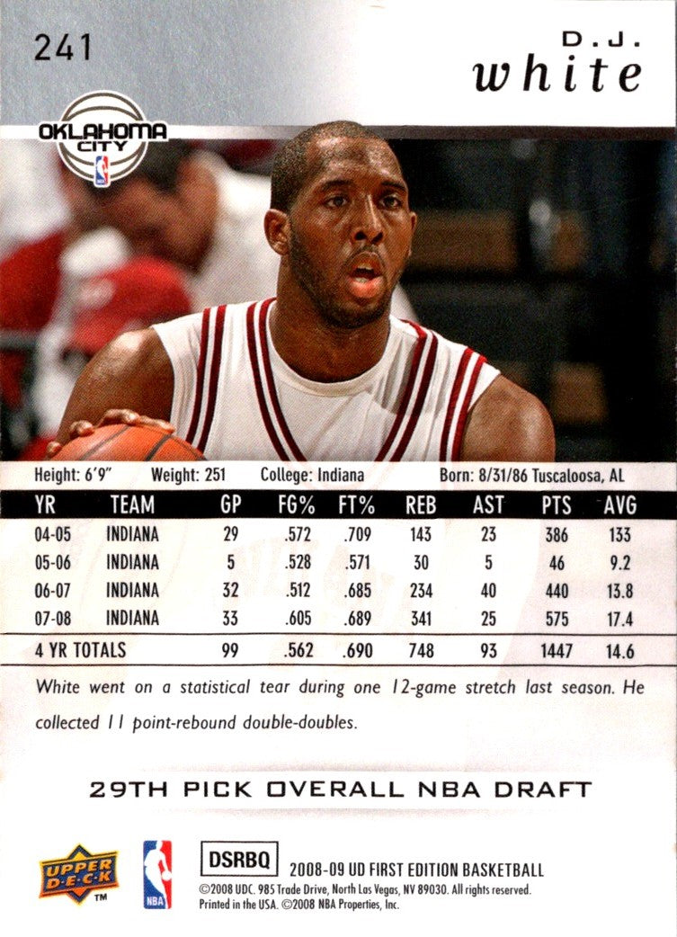 2008 Upper Deck First Edition D.J. White #241 Oklahoma City Thunder is the perfect addition to any Thunder basketball fan's collection. This card features a dynamic image of the player in action and shows off the team's bold team colors. The back of the card features a detailed biography and career stats of the player, making it a must-have for any fan. Don't miss your chance to own this collectible card and add it to your collection today!