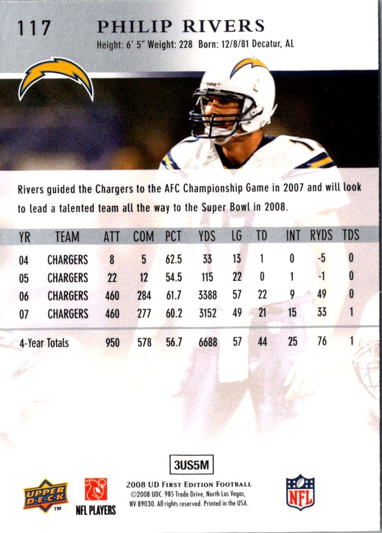 This 2008 Upper Deck First Edition Philip Rivers #117 card features the San Diego Chargers quarterback in a classic action shot. The card is printed on high-quality cardboard, with a glossy finish that makes the colors of the image pop. It's a must-have for any sports card collector or San Diego Chargers fan. Get your hands on this card and add a piece of football history to your collection.
