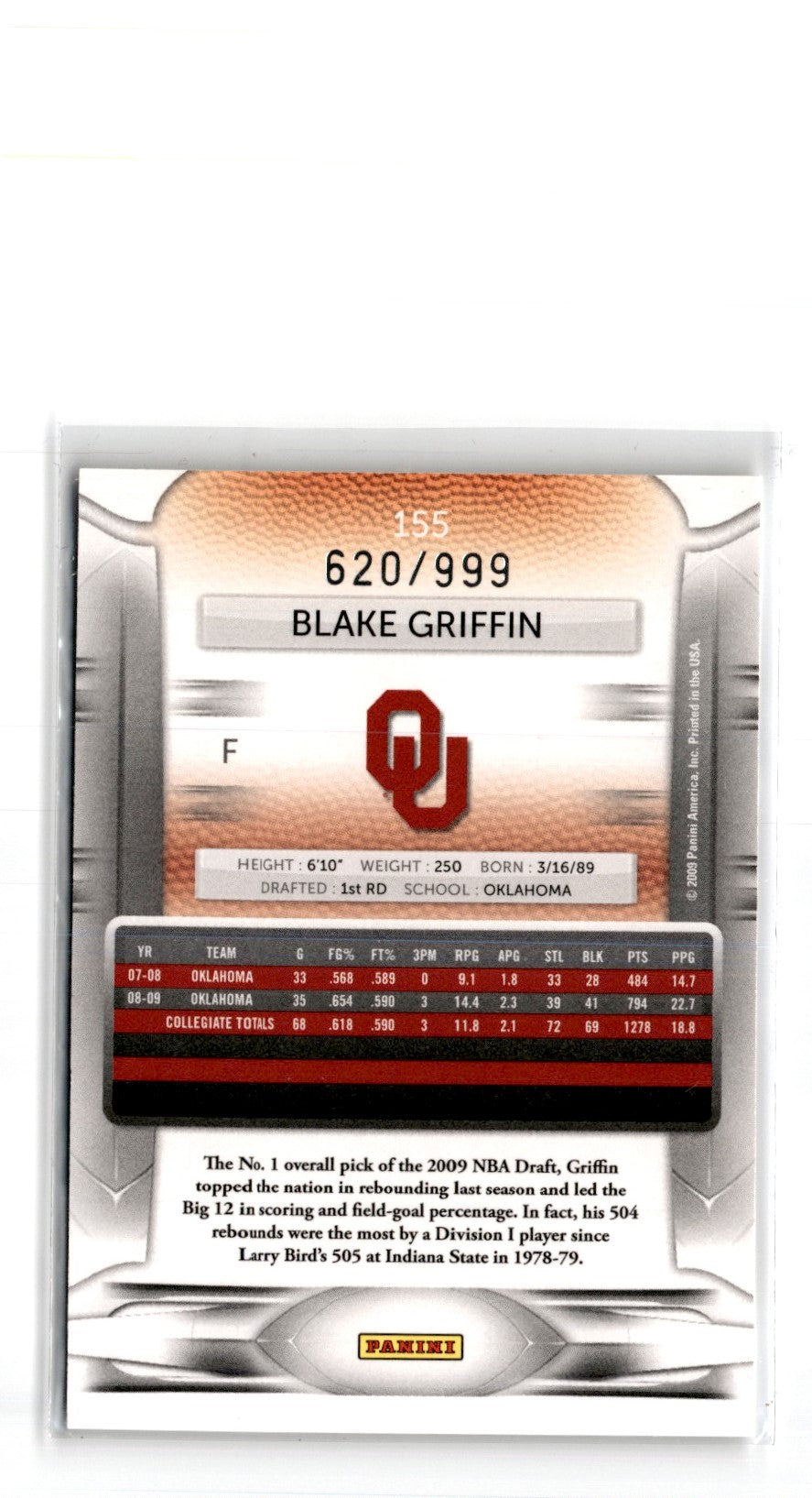 Description: 2009 Panini Prestige Draft Picks Light Blue Blake Griffin #155 620/999
