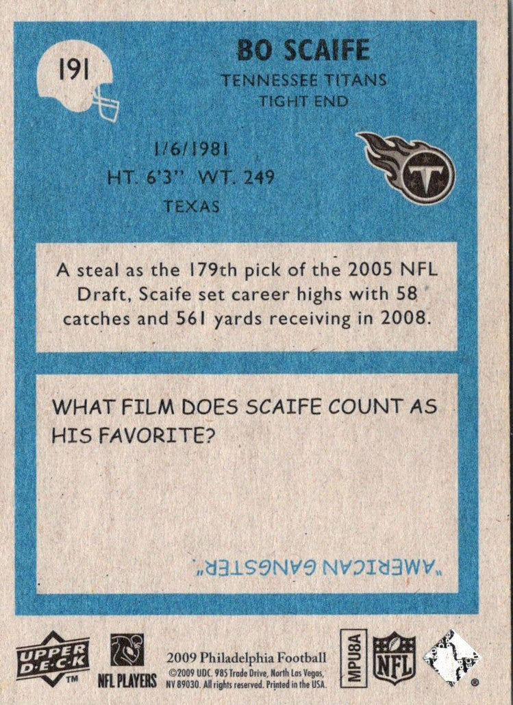 The 2009 Philadelphia Bo Scaife #191 Tennessee Titans trading card is a must-have collectible for any football fan. This card features an action shot of Scaife in a classic Titans uniform, as well as vital stats and career highlights. With vivid color and crisp detail, this card is sure to make an impressive addition to any collection. Show your support for the Titans and add this card to your collection today!