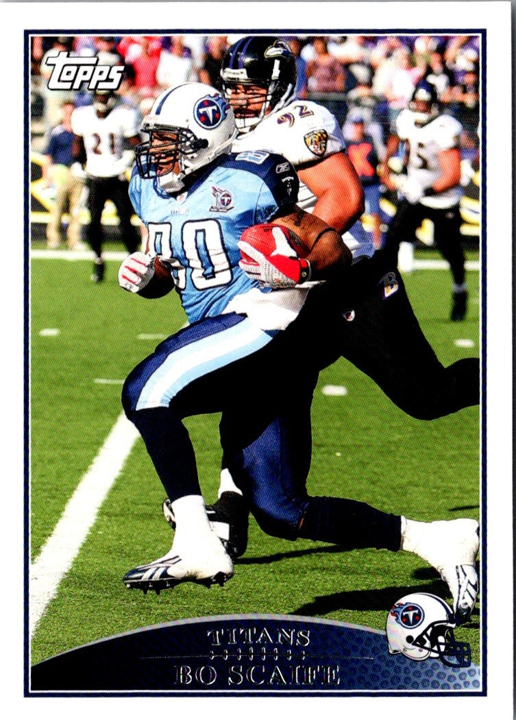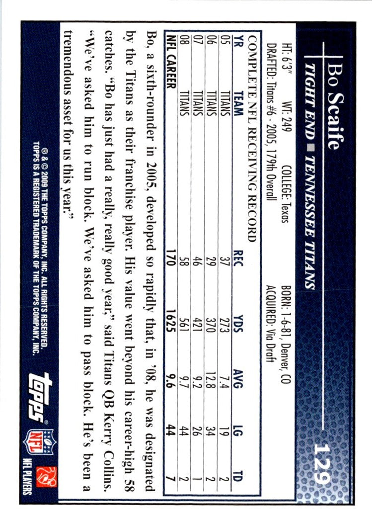 The 2009 Topps Bo Scaife #129 Tennessee Titans card is a must-have for any serious collector. Featuring a detailed image of Scaife in his Titans uniform, this card captures the essence of the Pro Bowl tight end. It also features Scaife's vital statistics, career highlights and team logo. Add this card to your collection and celebrate the glory days of Bo Scaife and the Tennessee Titans.
