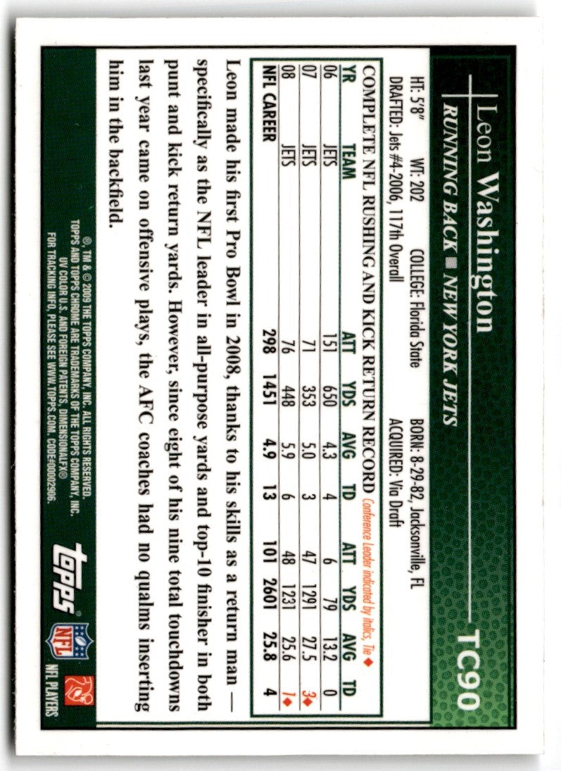 2009 Topps Chrome Leon Washington #TC90 New York Jets is a must-have for any serious NFL or Jets fan. This card features a stunning image of Washington on the field in his Jets uniform, and showcases his name and team prominently. The card also features a glossy chrome finish that gives it a unique look. With Washington's impressive career stats and accomplishments, this card is an excellent addition to any collection.