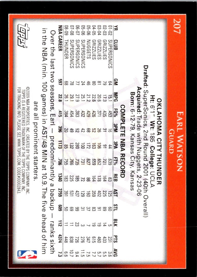 The 2009 Topps Earl Watson card #207 Oklahoma City Thunder is the perfect addition to any basketball card collector's collection. Featuring a high-quality image of Earl Watson in his Oklahoma City Thunder uniform, this card is sure to be a hit with any fan of the team. It's also a great way to celebrate one of the NBA's hardest-working players and his outstanding career. Get your hands on this card today and add a unique piece to your collection!