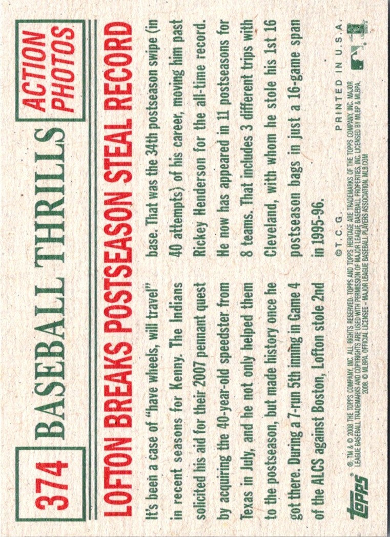 This 2009 Topps Heritage Kenny Lofton card celebrates the storied career of the former Indians outfielder. Featuring Lofton in his signature Cleveland Indians uniform, the card also contains a list of his career accomplishments. With 8 All-Star appearances, 4 Gold Glove Awards, and a World Series title, Lofton was one of the most dynamic players of his era. This card is a must-have for any fan of Kenny Lofton or the Indians.