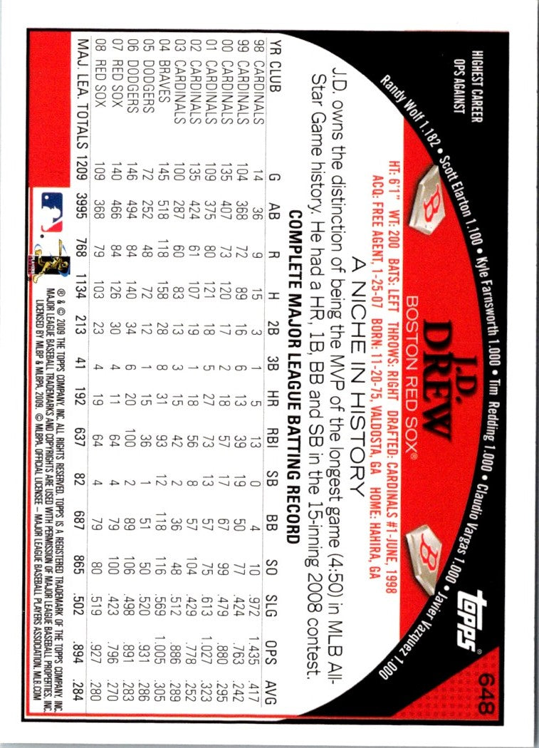 2009 Topps J.D. Drew #648 Boston Red Sox card features a sharp portrait of the legendary outfielder in his Red Sox uniform. With a glossy finish and bold colors, this card is a must-have for any serious Red Sox fan. Perfect for any collection, this card is sure to be a conversation starter. Add it to your collection today and show off your Red Sox pride!