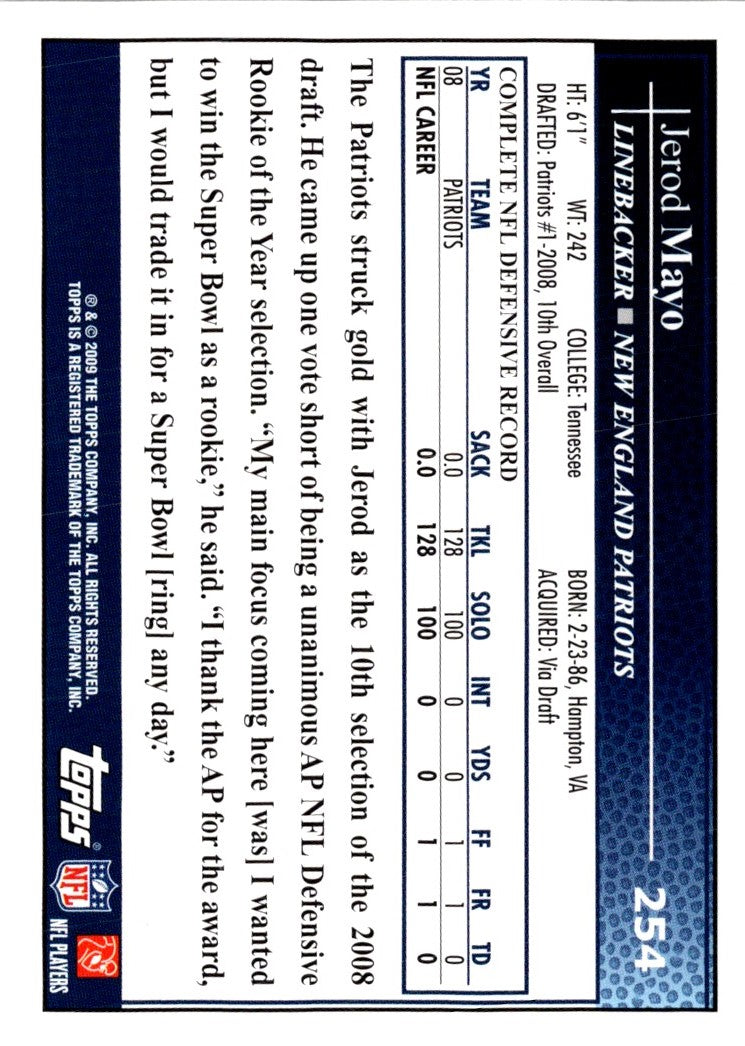 The 2009 Topps Jerod Mayo #254 card celebrates the New England Patriots' talented linebacker. Mayo was selected 10th overall in the 2008 NFL Draft and quickly made an impact, leading the team in tackles his rookie year. This card features an action shot of Mayo in his Patriots uniform, and is sure to be a great addition to any collection. Show your support for one of the NFL's most promising young players with this card today!