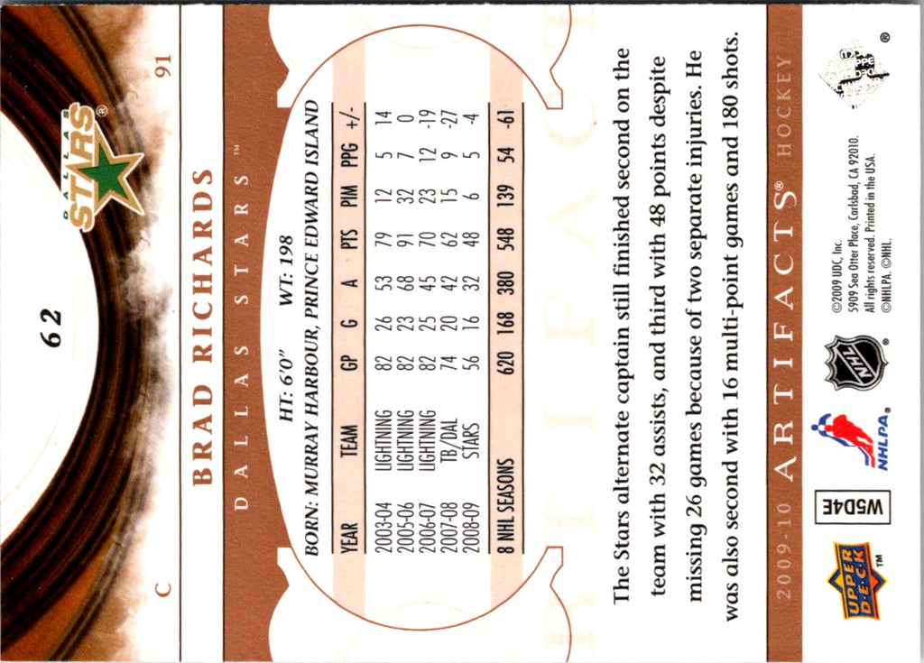 This 2009 Upper Deck Artifacts Brad Richards #62Dallas Stars card is a must-have for any hockey fan. The card features a picture of the legendary player in action wearing his Dallas Stars uniform. The card is printed on a thick card stock with clean edges that makes it look like a mini-poster. The back of the card includes a detailed biography of the player. This card is a great addition to any hockey fan's collection and a great way to commemorate the career of this legendary player.