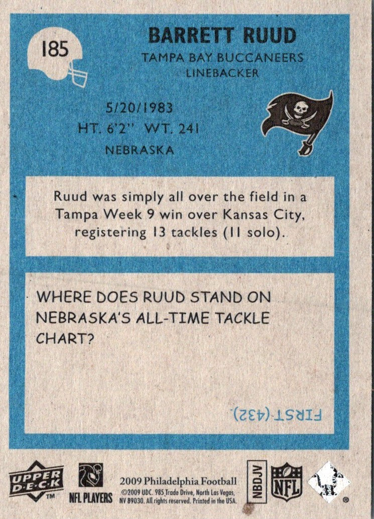 This 2009 Upper Deck Barrett Ruud #185 Tampa Bay Buccaneers card is a great addition to any football fan's collection. With crisp graphics and detailed photography, this card is sure to make a memorable keepsake. Ruud was a favorite of Tampa Bay fans as he racked up big numbers for the team, and this card captures all of his energy and enthusiasm. Collectors will love the bright colors and bold design of this card, and it will look great in any collection. Get your hands on this great card today!