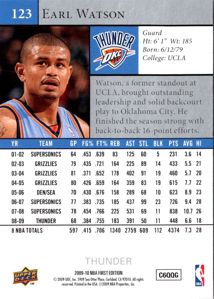 The 2009 Upper Deck First Edition Earl Watson #123 Oklahoma City Thunder card is the perfect addition to any basketball card collection! Featuring the star point guard in his Thunder jersey, this card is sure to be a hit with any sports fan. It is printed on thick cardstock for a high-quality finish and is sure to stand the test of time. With the vibrant colors of the Thunder jersey, it is an eye-catching card that will add a great touch to any collection. Add this card to your collection today!