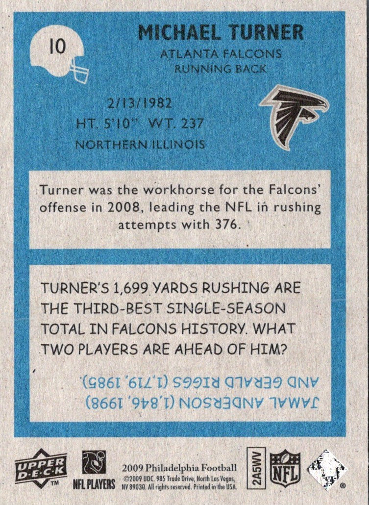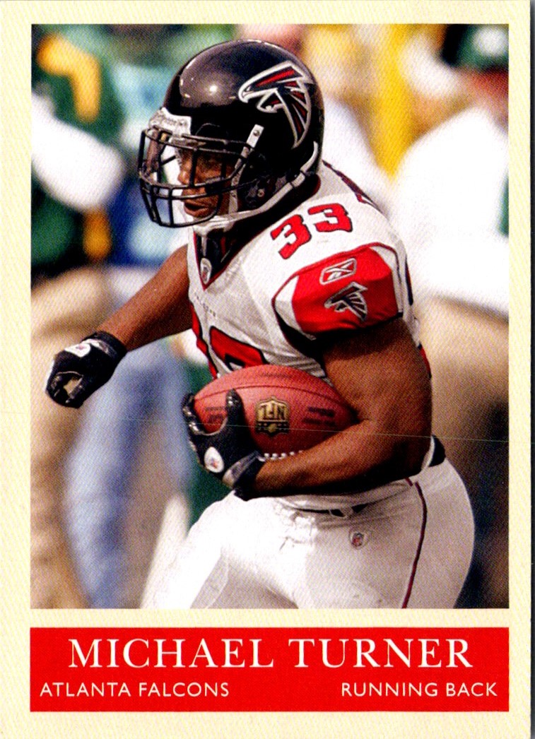 This 2009 Upper Deck First Edition Michael Turner #10 Atlanta Falcons card is a must-have for any Turner or Falcons fan. Showcasing Turner in a classic action pose, this card captures the power of his running style. The edge of the card features a metallic silver border, adding a touch of class to an already beautiful card. Don't miss your chance to add this card to your collection today!