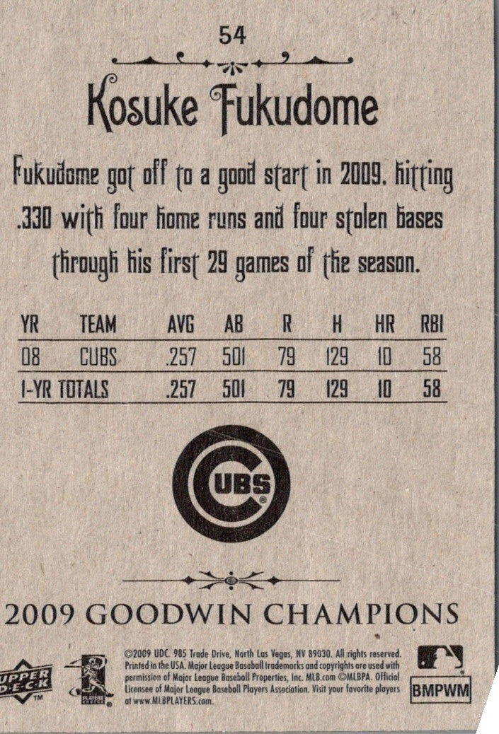 This 2009 Upper Deck Goodwin Champions Kosuke Fukudome card celebrates his first year with the Chicago Cubs. The card features a full-color action shot of Fukudome in his home uniform as he swings for the fences. With its bold red and blue team colors, this card is a must-have for any Cubs fan.