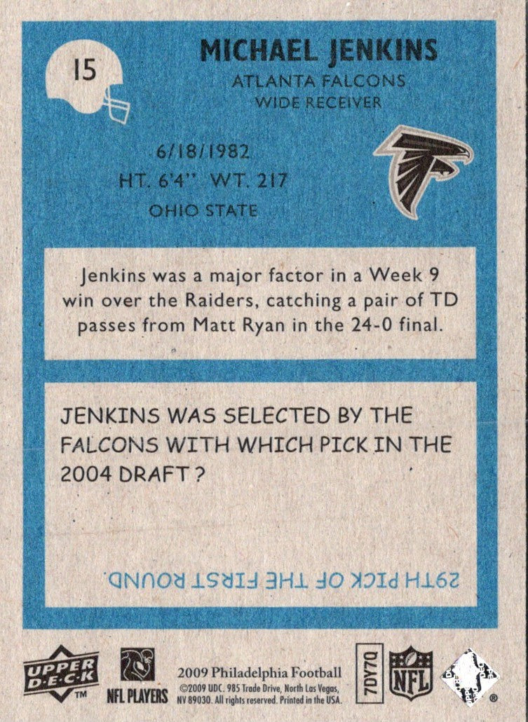 This 2009 Upper Deck Michael Jenkins #15 Atlanta Falcons trading card is a must-have for any football fan. This card highlights the most iconic player in Falcons franchise history, featuring a full-color, high-definition image of Jenkins on the front. On the back, you'll find detailed stats and a brief bio of the 5-time Pro Bowl receiver. This card is an essential piece of football memorabilia that is sure to become a collector's item. Get your hands on this card before it's too late!