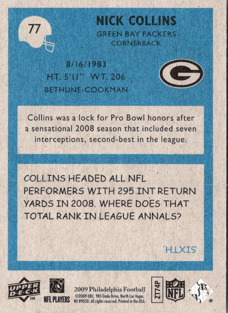 This 2009 Upper Deck Nick Collins #77 Green Bay Packers trading card is a must-have for any fan of the team! Featuring Nick Collins in a full-color action shot, this card is a great way to show your support for the Packers and to commemorate one of the team's most successful players. The back of the card features a detailed career summary, so you can learn more about Nick Collins and his accomplishments. Add this card to your collection today and show your support for the Green Bay Packers!