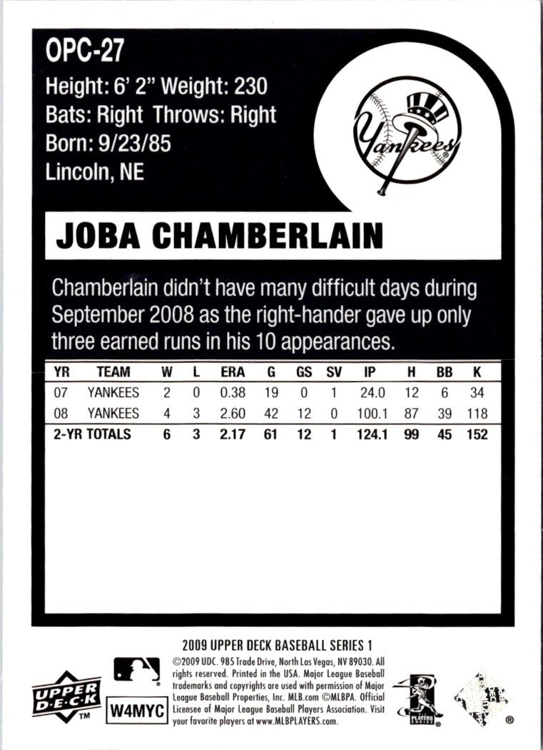 2009 Upper Deck O-Pee-Chee Joba Chamberlain #OPC-27 celebrates the New York Yankees star pitcher. This classic baseball card features Chamberlain in his iconic Yankees pinstripes. His name and number are featured on the back of the card, as well as his team logo and career stats. Add Joba Chamberlain to your collection and own a piece of baseball history.