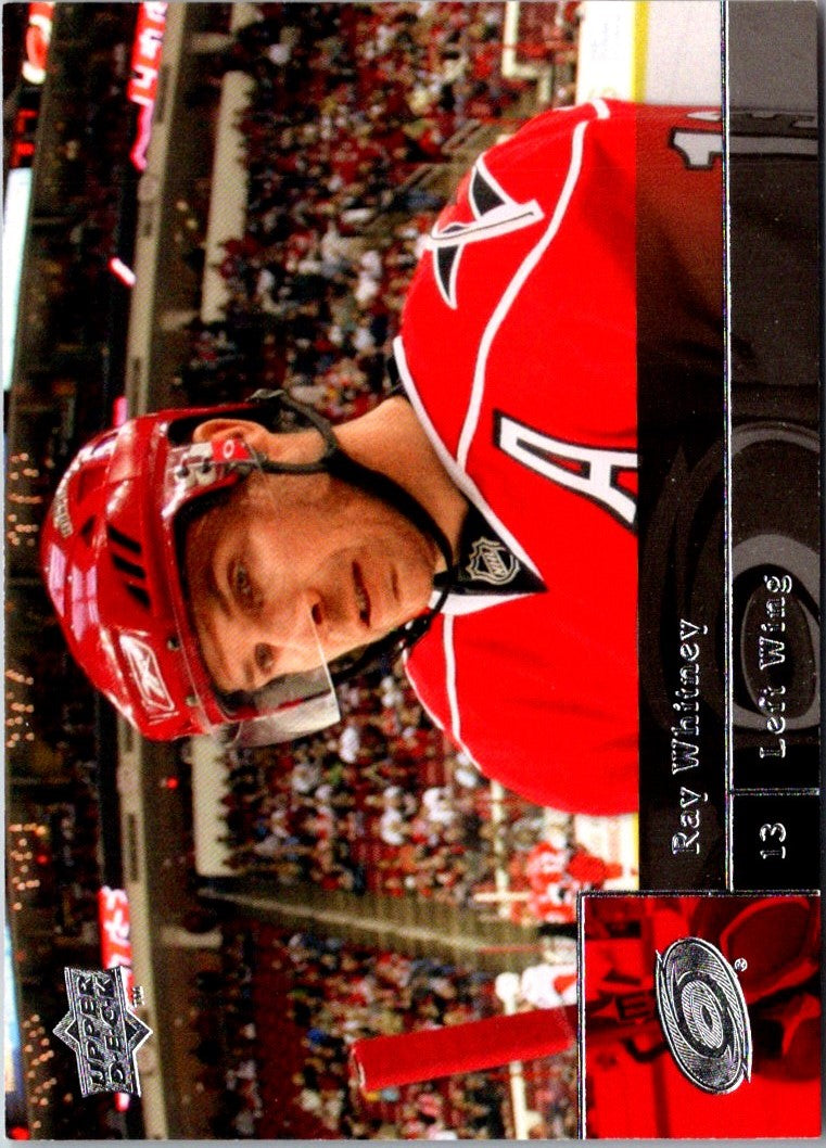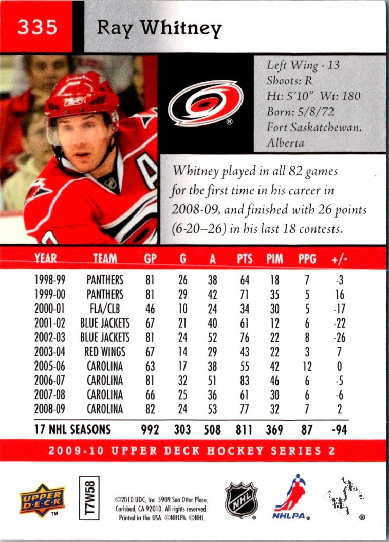 This 2009 Upper Deck Ray Whitney #335 Carolina Hurricanes card is a great way to commemorate the career of one of hockey's all-time greats! With sharp, vibrant colors and a glossy finish, this card makes a great addition to any sports memorabilia collection. It features a picture of Whitney in his Hurricanes jersey with a detailed biography on the back. Add this card to your collection today and honor the legacy of Ray Whitney!