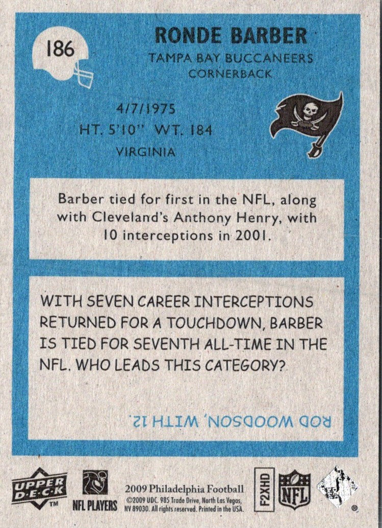 This 2009 Upper Deck Ronde Barber #186Tampa Bay Buccaneers card captures the veteran defensive back in action for the Buccaneers. Ronde has been an anchor of the Bucs defense for many years, and this card is a great way to honor his career. Featuring a detailed design and a stunning full-color action shot, this card is sure to be a great addition to any fan's collection. Add this card to your collection today and honor one of the best defensive backs in the NFL!