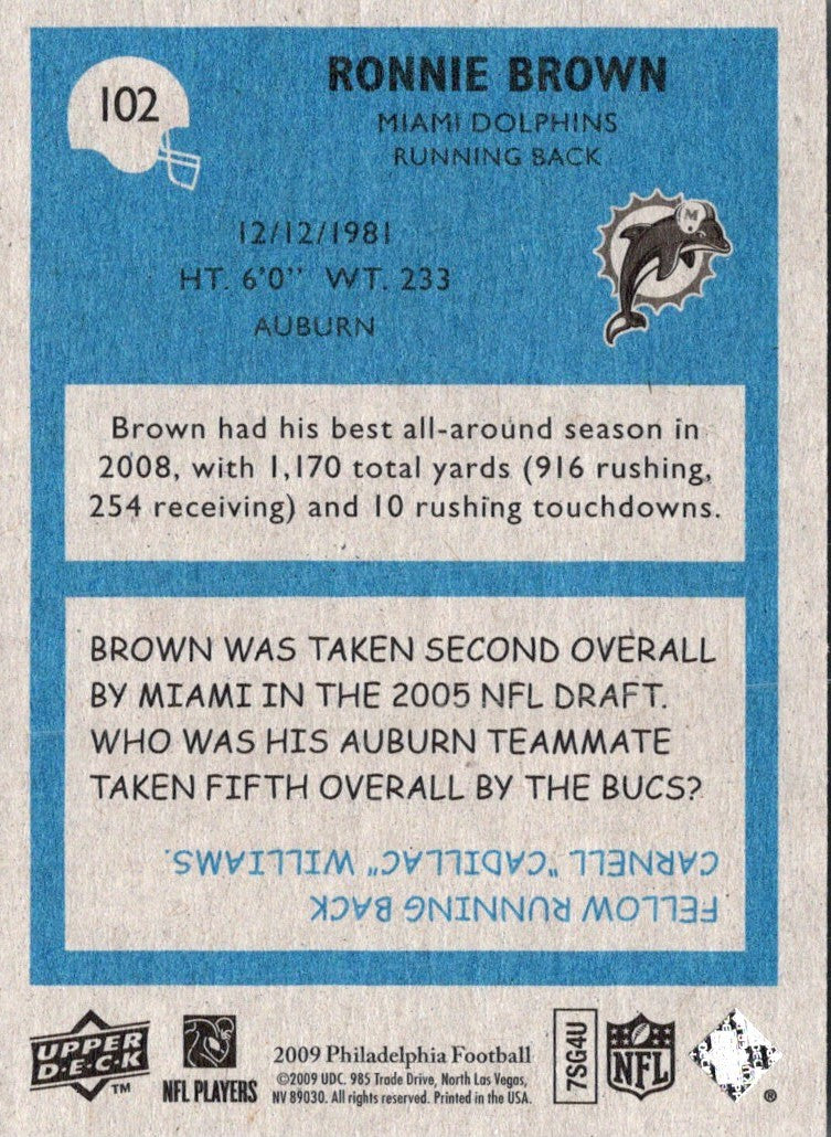 This 2009 Upper Deck Ronnie Brown #102 card is a must-have for a Miami Dolphins fan! Show your support for the star running back with this card, which features a full-color photo of Brown in his Dolphins uniform. This card is a great way to commemorate Brown's success on the field, and is sure to be a hit with any fan. Keep it as a collectible or give it to a friend - either way, it's sure to bring a smile to their face. Get your 2009 Upper Deck Ronnie Brown #102 card today!