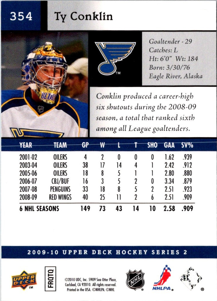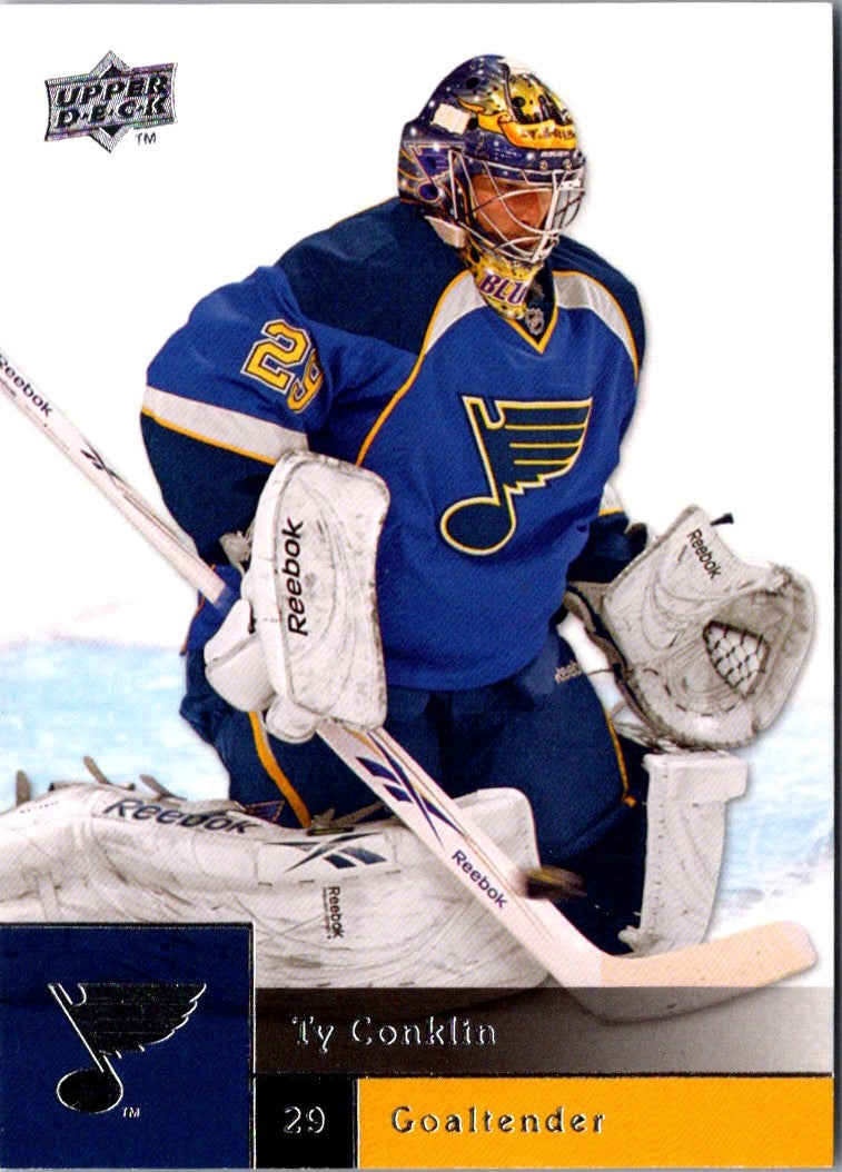 This 2009 Upper Deck Ty Conklin #354 St. Louis Blues trading card is an excellent addition to any hockey fan's collection. The card features a beautiful color photo of Ty Conklin in full goalie gear, ready to make the save. The reverse side of the card has a detailed description of Conklin's career highlights and stats. Perfect for any die-hard St. Louis Blues fan or hockey collector.