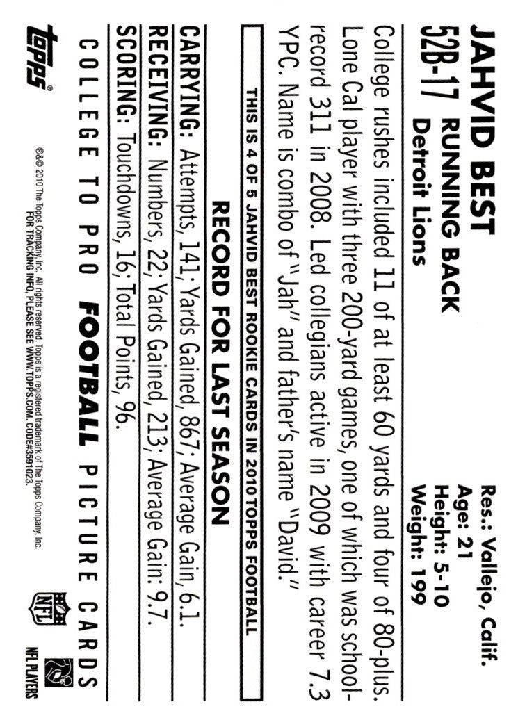 This 2010 Topps 1952 Bowman Jahvid Best card #52B-17 is a must-have for any Detroit Lions fan! The card features a fantastic image of Best in his classic Lions jersey, with bold colors and sharp details that really pop. It's perfect for any collection, and makes a great gift for any fan. Don't miss out on your chance to own this piece of sports history!