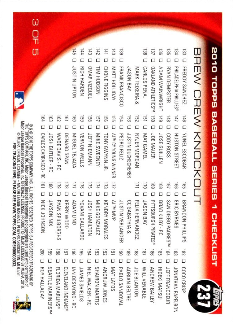 This 2010 Topps Brew Crew Knockout #237 Milwaukee Brewers card celebrates the team’s long tradition of success and its loyal fan base. This card features a great shot of one of the team’s players in action, as well as a detailed description on the back. This is the perfect way for any Brewers fan to show their support for the team, and it will make a great addition to any collection. Get your 2010 Topps Brew Crew Knockout #237 Milwaukee Brewers card today!