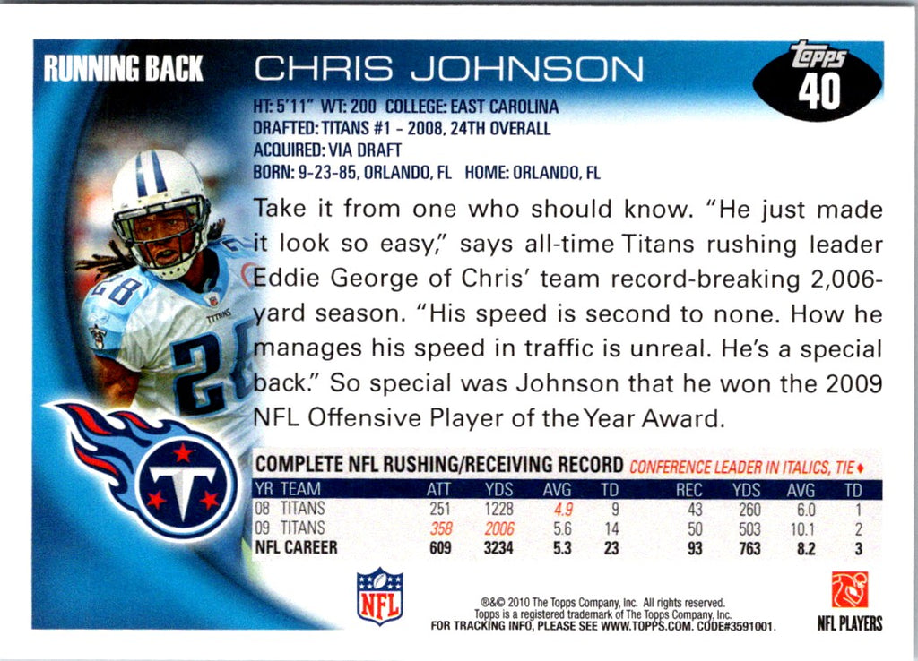 This 2010 Topps Chris Johnson #40 Tennessee Titans card is the perfect way to show your support for one of the greatest running backs of all time. This glossy card features a full-color action shot of Johnson, with a detailed biography and stats on the back. The card is in mint condition, and would make a great addition to any Titans fan's collection.