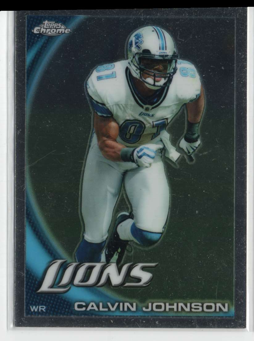 Introducing the 2010 Topps Chrome Calvin Johnson #C193 card from the Detroit Lions. This card showcases the star wide receiver in a dynamic action pose, highlighted by the iconic chrome finish. With sharp corners and crisp edges, this card is sure to make an impressive addition to any collection. Show your support for the Detroit Lions and celebrate one of the team's greatest players with this classic card.