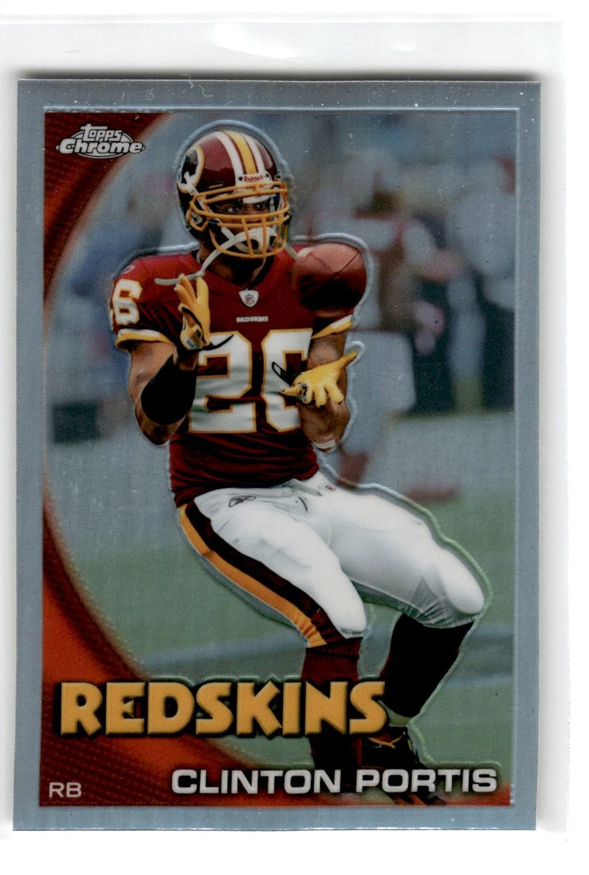 This 2010 Topps Chrome card featuring Clinton Portis of the Washington Redskins is a must-have for any football fan's collection. The card features a bold, vibrant full-color photo on the front with a unique border design. On the back, you'll find all of Portis' vital stats and career highlights. This card is sure to be a great addition to any fan's collection!