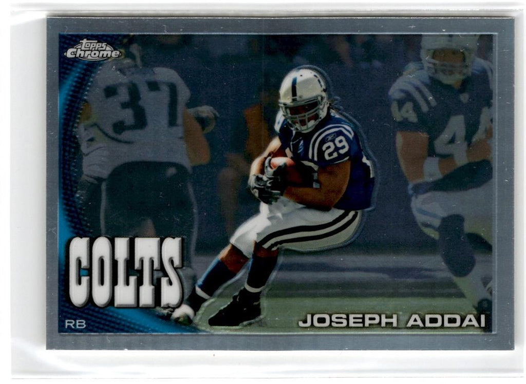The 2010 Topps Chrome Joseph Addai #C154 Indianapolis Colts card is a must-have for all Colts fans. This card features a stunning full color illustration of Addai in all his glory, complete with his signature number and team colors. The card is printed on premium glossy chrome card stock for maximum impact and durability. The back of the card contains Addai’s stats and career highlights, as well as a brief biography. This card is a great way to commemorate one of the best running backs in Colts history. Add this card to your collection today and proudly show off your Colts pride!