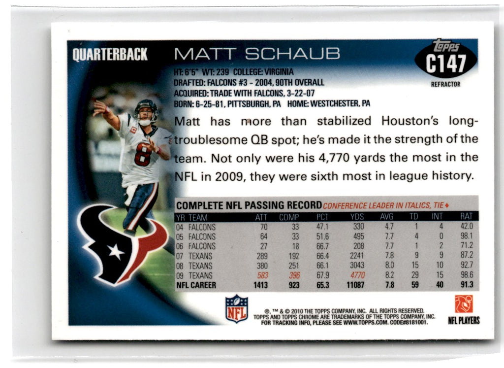 This 2010 Topps Chrome Matt Schaub #C147 is a great addition to any Houston Texans fan's collection. Boasting a vivid image of the quarterback in full action, this card serves as an excellent reminder of Schaub's incredible athletic ability. The card is further enhanced with a chrome finish to bring the card's details to life. It's the perfect piece of memorabilia to commemorate the team's successes of the 2010 season.
