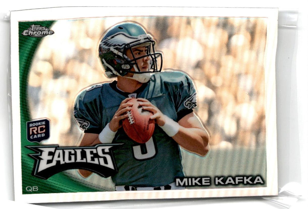 The 2010 Topps Chrome Mike Kafka #C139 features a crisp and detailed image of the star quarterback for the Philadelphia Eagles. The card is a great addition to any collection, as it captures the energy of the Eagles and Kafka's talent on the field. The card has a glossy chrome finish, so it stands out and looks great when displayed. The card also includes a detailed biography on the back, giving you more information about Kafka's career. Add this card to your collection, and you'll have a great reminder of one of the Eagles' most talented players.