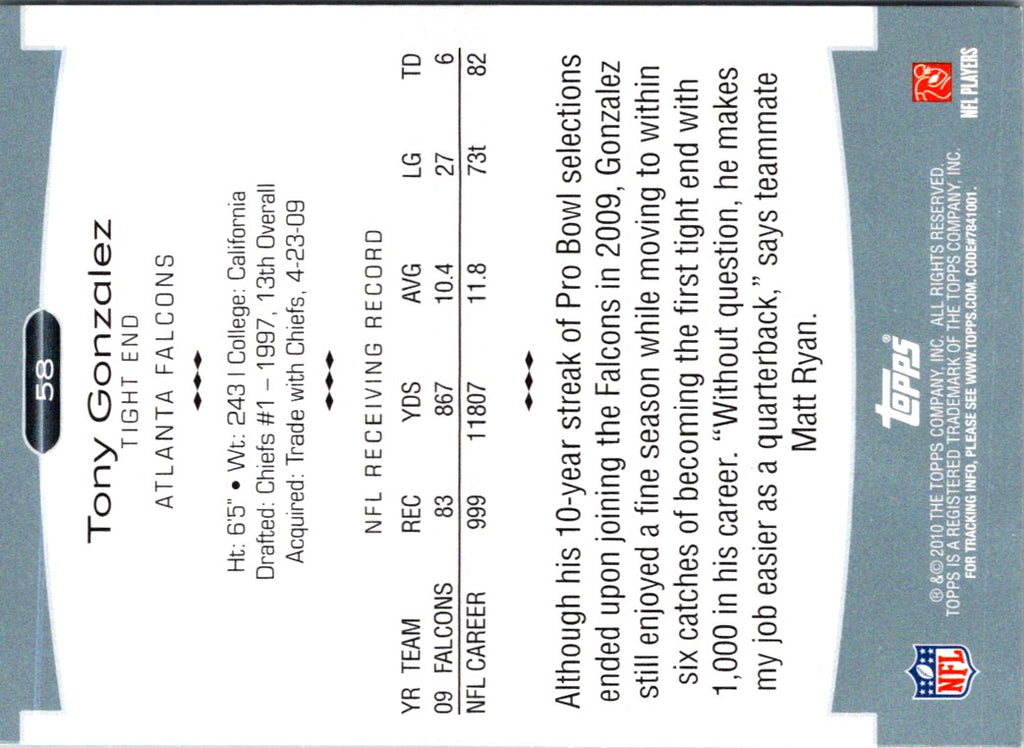Description: 2010 Topps Platinum Tony Gonzalez #58