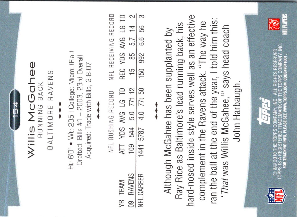 This 2010 Topps Platinum Willis McGahee #154 will make a great addition to any Ravens fan's collection. Displaying an action shot of Willis McGahee in his blue and purple Ravens uniform, this card is sure to be a hit with any collector. Show your love for the Ravens and Willis McGahee with this unique card. Each card is made with Topps' high quality standards, making this a must-have for any fan. Don't miss your chance to get your hands on this exclusive card!
