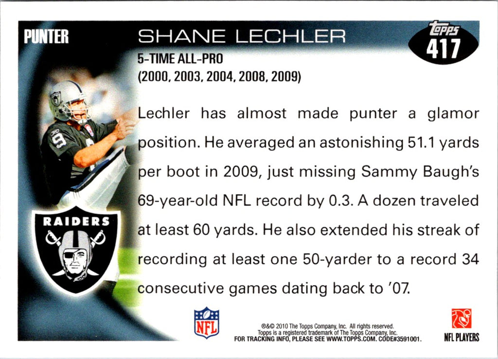This 2010 Topps Shane Lechler #417 Oakland Raiders card is a must-have for any Raiders fan. Featuring a glossy image of the legendary punter in his classic Raiders uniform, this card will bring back memories of all the great plays he made for the team. It's a great addition to any collection, and a great way to show your support for the Silver and Black. Don't miss out on this collectible card and add it to your collection today!