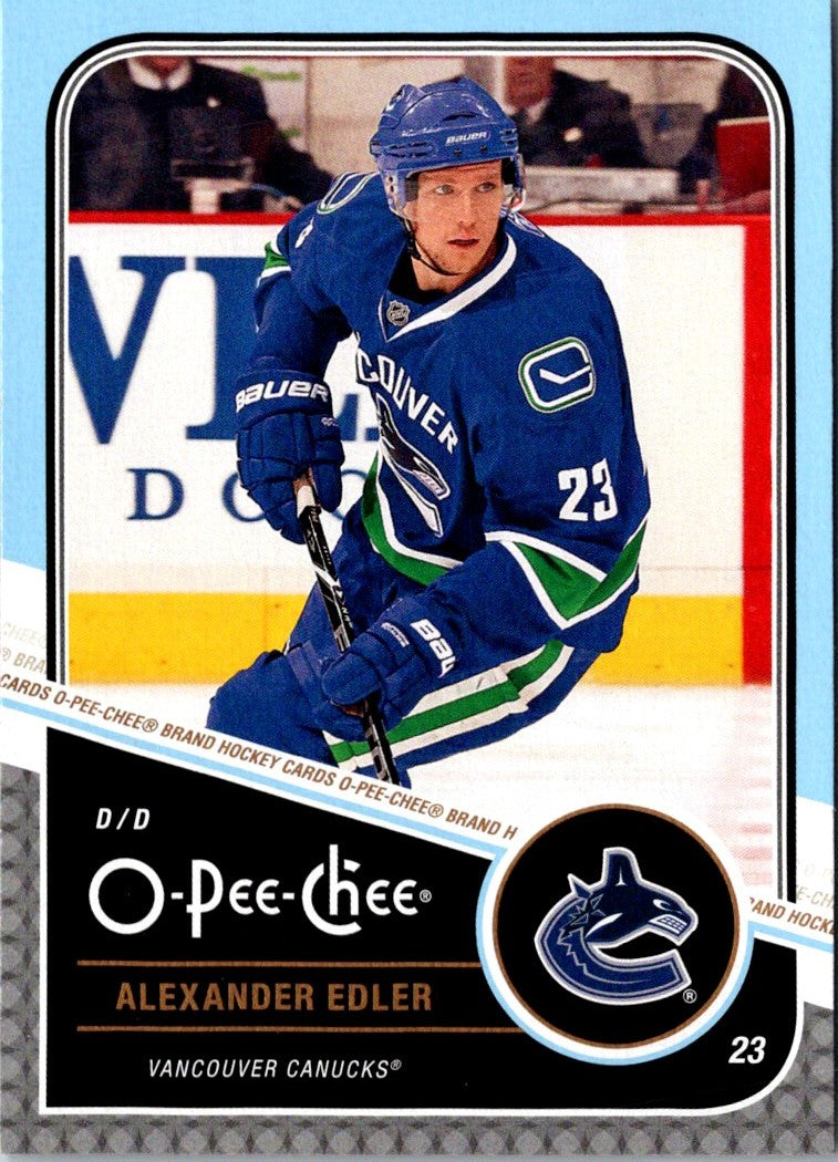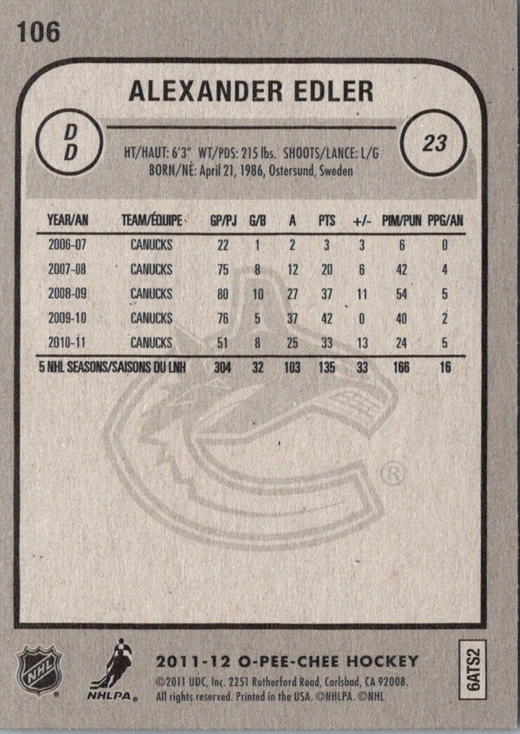 This 2011 O-Pee-Chee Alexander Edler #106 card is a must-have for any Vancouver Canucks fan! This card features a glossy finish and a classic design. The card captures the essence of the Vancouver Canucks in vibrant colors and showcases a great action shot of Alexander Edler! This card is a great way to show your team pride and celebrate one of the Canucks' star players. Add this card to your collection today and show your Canucks spirit!