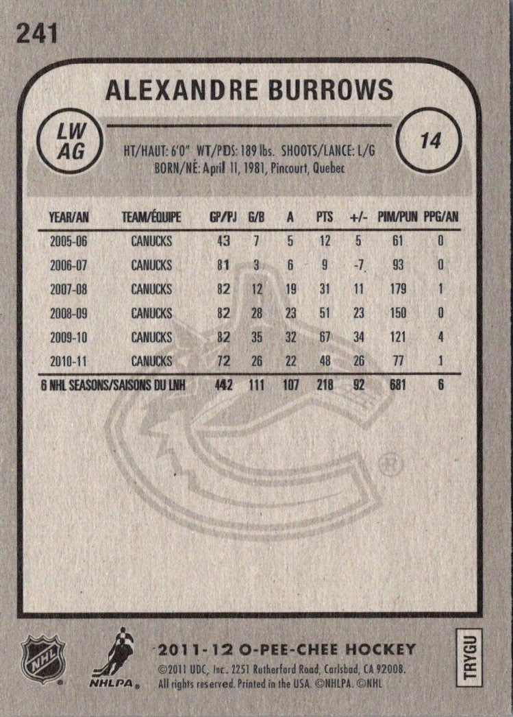 This 2011 O-Pee-Chee Alexandre Burrows #14 Vancouver Canucks hockey card is the perfect addition to any avid collector. Burrows was known for his gritty style of play and this card is a great reminder of what he brought to the ice. Burrows was an essential part of the 2011 Canucks team and led them to the Stanley Cup Finals with his passion and drive. This card is a great way to commemorate his career and his time with the Canucks. Add this card to your collection today and show your support for one of the greatest players to ever wear the Canucks jersey.