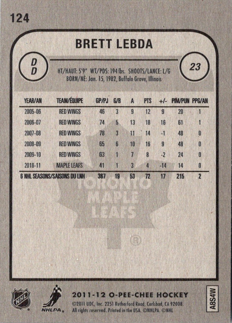 This 2011 O-Pee-Chee Brett Lebda card is a great addition to any NHL hockey fan's collection. It features a full color photo of Lebda in action on the ice with the Toronto Maple Leafs. The card features vibrant colors and a glossy finish, making it a great item to display in any hockey fan's collection. The card also includes a detailed biography of Brett Lebda on the back, making it a unique keepsake for any hockey fan. Don't miss out on this chance to own a piece of Toronto Maple Leafs hockey history.