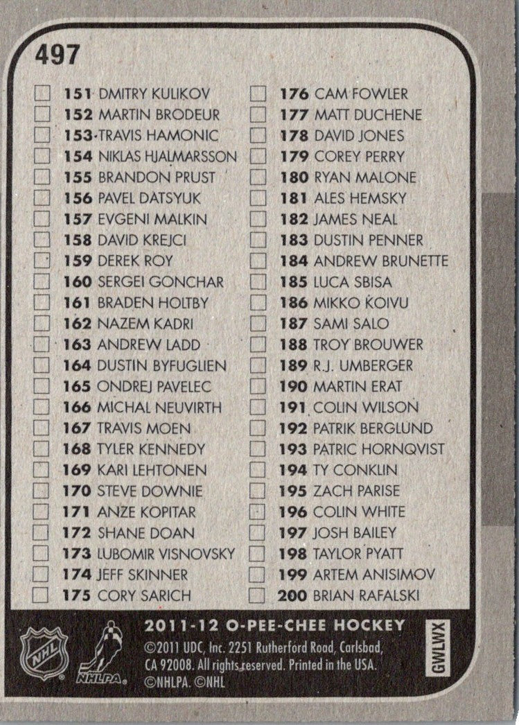 This 2011 O-Pee-Chee Checklist #497 card is a must-have for any hockey card collection. Featuring a high-quality image of the great player, this card is sure to be a favorite among collectors. The card is well-designed with a vibrant background and a full gloss finish, making it a great item to display. With it's detailed information about the player, this card is a great way to stay up to date on the NHL. Add this card to your collection today and be sure to impress your friends with a piece of hockey history.
