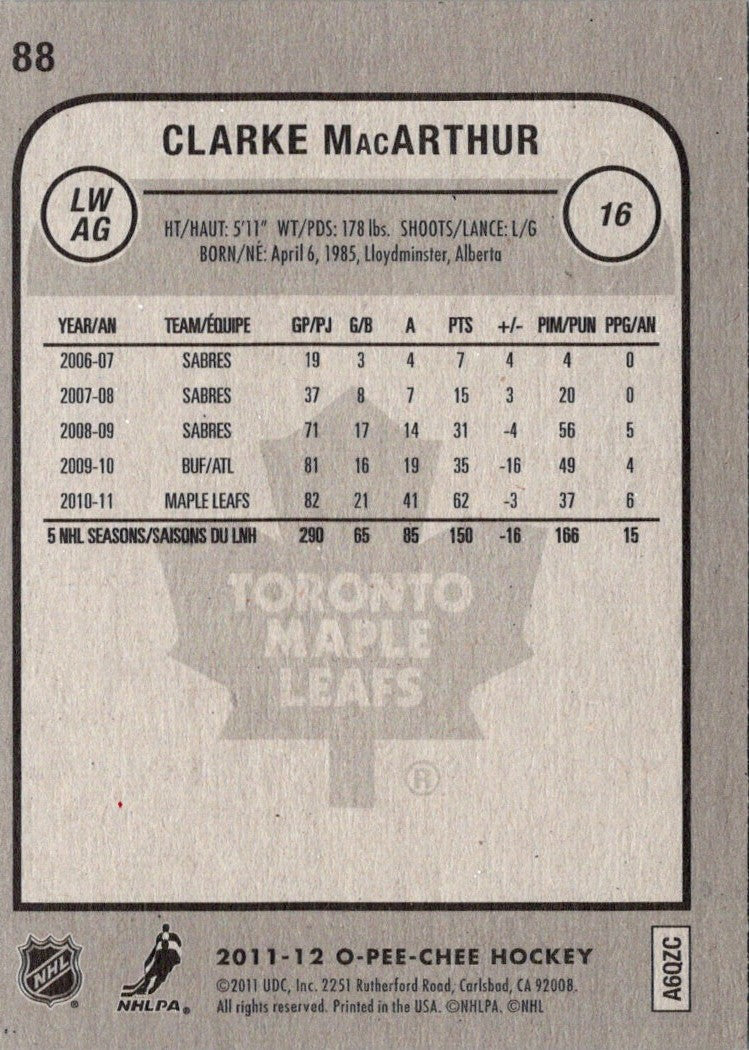 This 2011 O-Pee-Chee Clarke MacArthur #88 Toronto Maple Leafs card is a must-have for any Maple Leafs fan. This card features the official team logo and colors, and features a full-color action shot of Clarke in action on the ice. The back of the card features a full bio of the player, including his career stats and achievements. This card is a great way to collect your favorite player and show your support for the Toronto Maple Leafs. Add this card to your collection today and show your Maple Leafs pride!