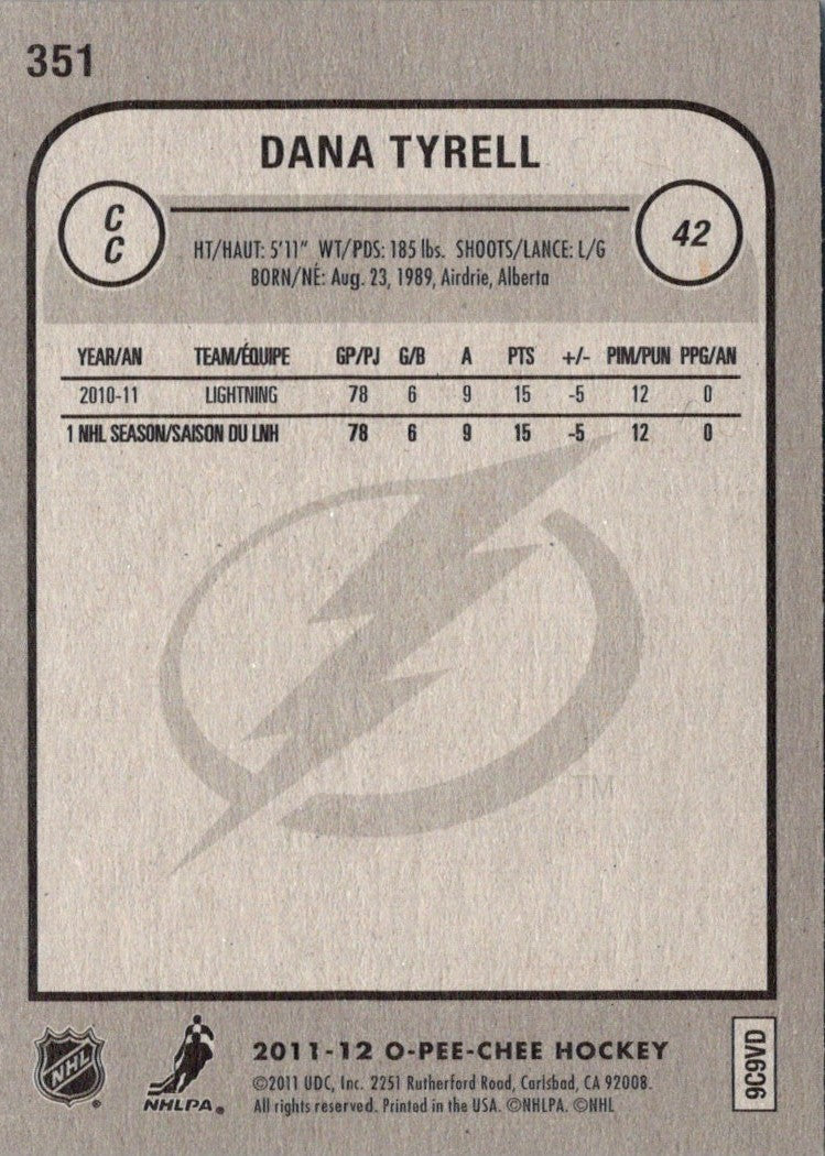 This 2011 O-Pee-Chee Dana Tyrell card #351 from the Tampa Bay Lightning is a great addition to any hockey card collection. This card features a crisp, clean image of Tyrell in his blue Lightning uniform. The card is printed on premium quality card stock that is sure to last a lifetime. The back of the card provides a brief biography of Tyrell and his career stats with the Lightning. With this card you can bring the excitement of the Lightning to your collection.