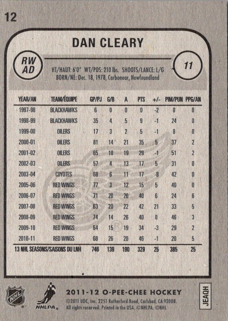 The 2011 O-Pee-Chee Daniel Cleary #12 Detroit Red Wings card is a must-have for any NHL collector. The card features an iconic image of Cleary on the ice in his Red Wings uniform, looking intense and ready for action. The card is printed on high-quality card stock with vibrant colors and crisp details that are sure to stand the test of time. An ideal addition to any fan's collection, this card is sure to be a conversation piece for years to come.