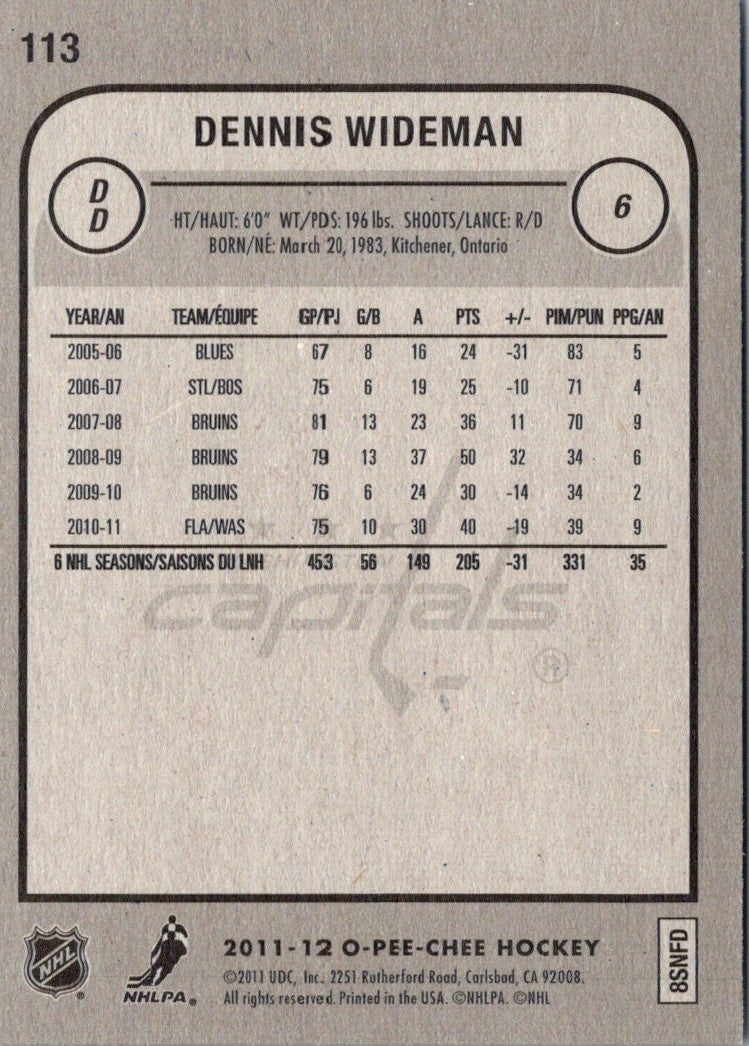This 2011 O-Pee-Chee Dennis Wideman #113 Washington Capitals card is a great addition to any hockey fan's collection. Featuring a crisp, clear image of Wideman in action, this card is sure to be a staple in any Capitals fan's collection. With great detail and sharp colors, this card is perfect for any fan looking to commemorate Wideman's career. With the Washington Capitals logo on the front, this card will bring back memories of Wideman's time with the team. Get your hands on this must-have card today!