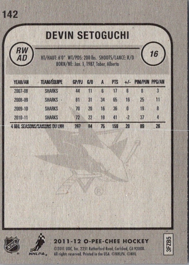 This Devin Setoguchi 2011 O-Pee-Chee card is the perfect addition to any die-hard San Jose Sharks fan's collection. The card features a high-gloss finish, vibrant colors, and crisp details. It showcases Setoguchi in action, decked out in his Sharks uniform. The back of the card contains his stats and a brief bio about the player. Add this card to your collection and show your support for the Sharks!