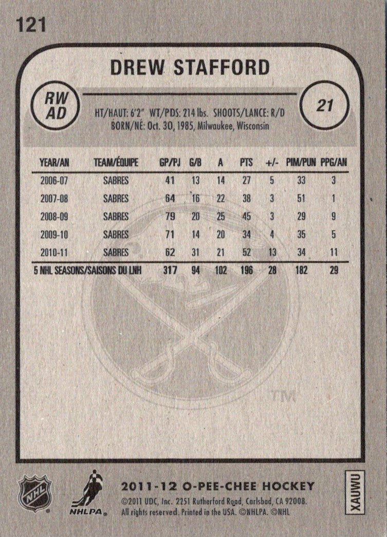 Introducing the 2011 O-Pee-Chee Drew Stafford #121 Buffalo Sabres card! This card features a photo of Stafford in his Sabres jersey, and all of the details of his career. Show your support for the Sabres and Stafford with this card that is perfect for any fan's collection. Get your hands on this card today and add a piece of Sabres history to your collection.