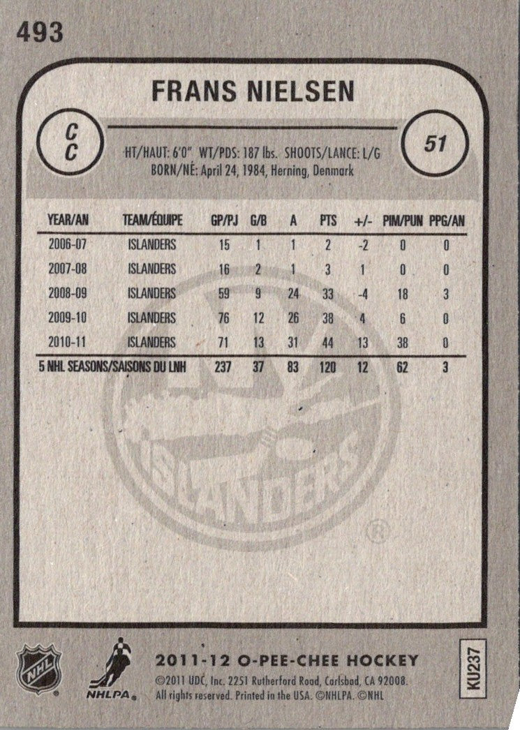 The 2011 O-Pee-Chee Frans Nielsen #493 is the perfect addition to any New York Islanders fan's collection. Featuring a colorful and detailed image of the Islanders' forward, it's a great way to show your team pride. It is printed on high-quality card stock, and is an essential part of any Islanders fan's memorabilia. With this card, you can relive all of Nielsen's great moments with the Islanders, and show your team pride in style.