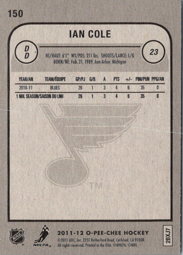 This 2011 O-Pee-Chee Ian Cole #150 St. Louis Blues trading card features an action shot of Cole on the ice, ready to take on the competition. The card showcases Cole's stats from the 2010-2011 season, including games played, goals scored, and assists. A must-have for any St. Louis Blues fan, this card is sure to be a great addition to any hockey card collection.