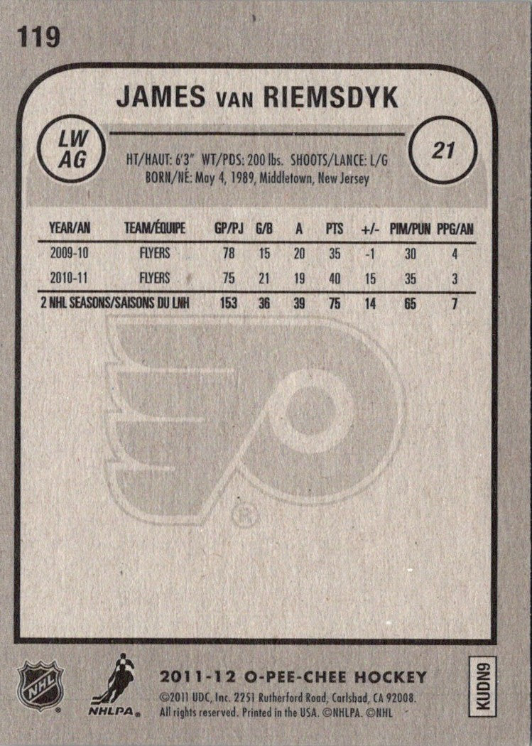 This 2011 O-Pee-Chee James van Riemsdyk card #119 is a must-have for any Philadelphia Flyers fan. This card features a full-color action shot of JVR in his classic Flyers uniform, complete with official team logo and colors. The card also includes his full name and position on the back. Add this card to your collection and show your support for one of the top stars of the franchise.