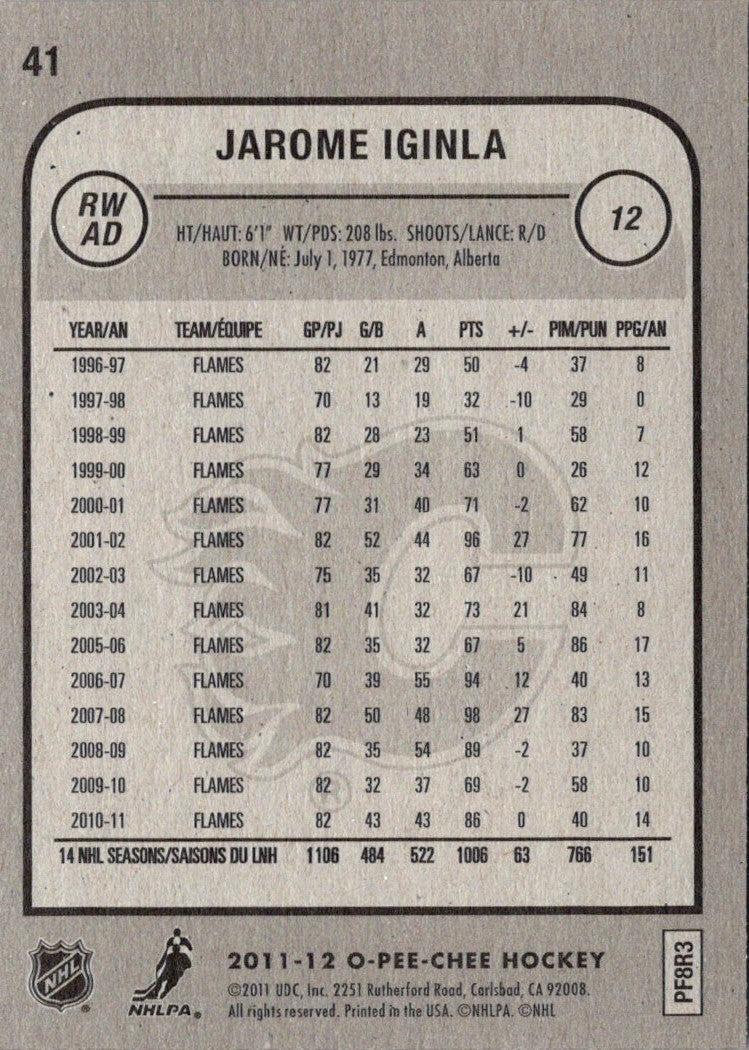 This 2011 O-Pee-Chee Jarome Iginla #41 Calgary Flames card is a must-have for any Flames or hockey fan! Featuring an action shot of Iginla in his Flames uniform, this card is sure to bring a smile to any collector's face. From his impressive career stats to his leadership on the ice, this card is a great way to honor one of the greatest players of all time. Add this classic card to your collection today and celebrate the illustrious career of Jarome Iginla!