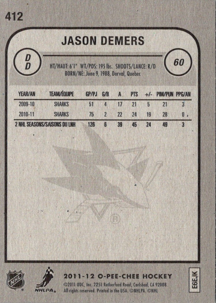 This 2011 O-Pee-Chee Jason Demers card from the San Jose Sharks is a must-have item for any hockey fan! With a glossy finish and crisp, vibrant colors, this card features a head-and-shoulders shot of Demers in his Sharks jersey. The back of the card includes an action photo of Demers and his player stats. Put this card in your collection today and show your support for the San Jose Sharks!